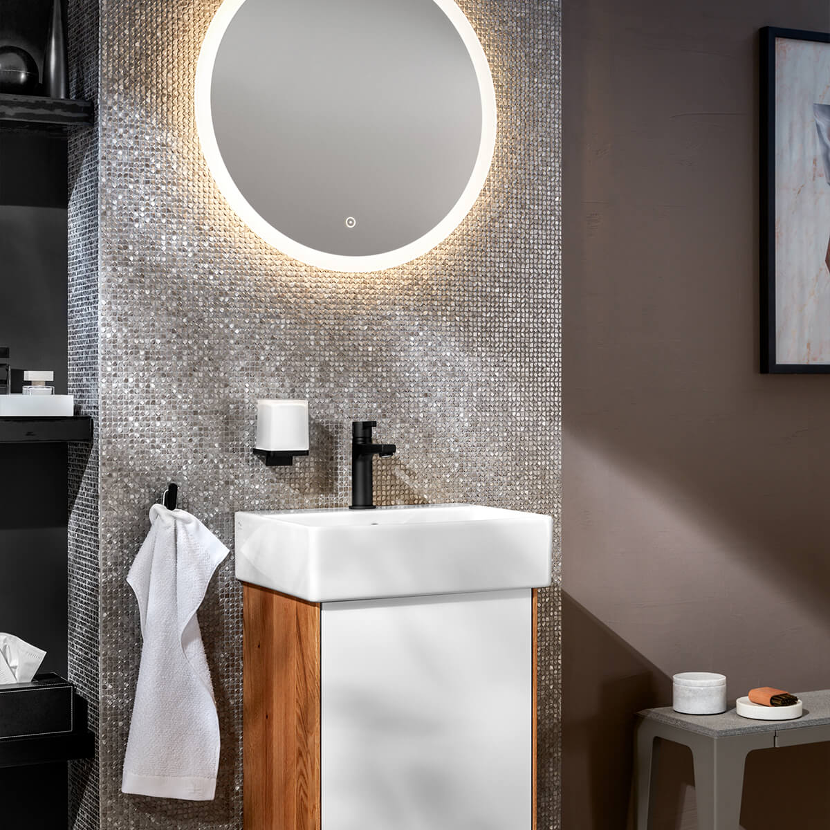 Ein Spiegel mit integrierter Beleuchtung oder ein Display sorgen für gute Sicht und moderne Optik. Mit mutigen Wandfarben setzen Sie stilvolle Akzente, Pflanzen bringen Frische und Atmosphäre ins Gästebadezimmer.